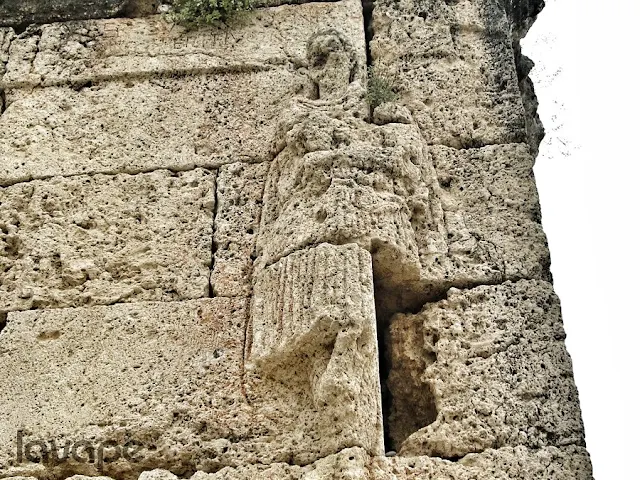 En el interior del cuerpo superior se hallaba la cámara funeraria para depositar las urnas con las cenizas de los difuntos. En la fachada principal de este cuerpo se conserva, muy desgastado, un bajo relieve con dos figuras, que representan, probablemente, a las personas enterradas en el monumento.